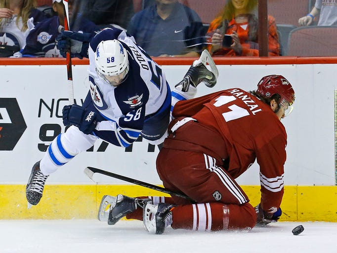 After working into prime playoff position with a strong three-game Eastern road trip last week, the Phoenix Coyotes have returned home and played themselves right back into the danger zone. Andrew Ladd scored the Winnipeg Jets' only goal in regulation and converted the deciding goal in the shootout in a 2-1 win against the Coyotes on Tuesday at Jobing.com Arena. The Coyotes, who lost at home to the Minnesota Wild on Saturday, dropped out of the Western Conference's final wild-card spot for the Stanley Cup Playoffs by failing to earn two points against the Jets. The streaking Dallas Stars beat the Washington Capitals 5-0 on Tuesday, drawing even with Phoenix at 85 points, and moved into the wild card by virtue of having one game in hand. Phoenix knew it had to win to stay ahead of Dallas, which trailed Phoenix by five points after the Coyotes completed their road trip at 2-0-1 with a 3-2 shootout win against the New Jersey Devils on March 27. Zbynek Michalek's goal early in the second period wasn't enough.