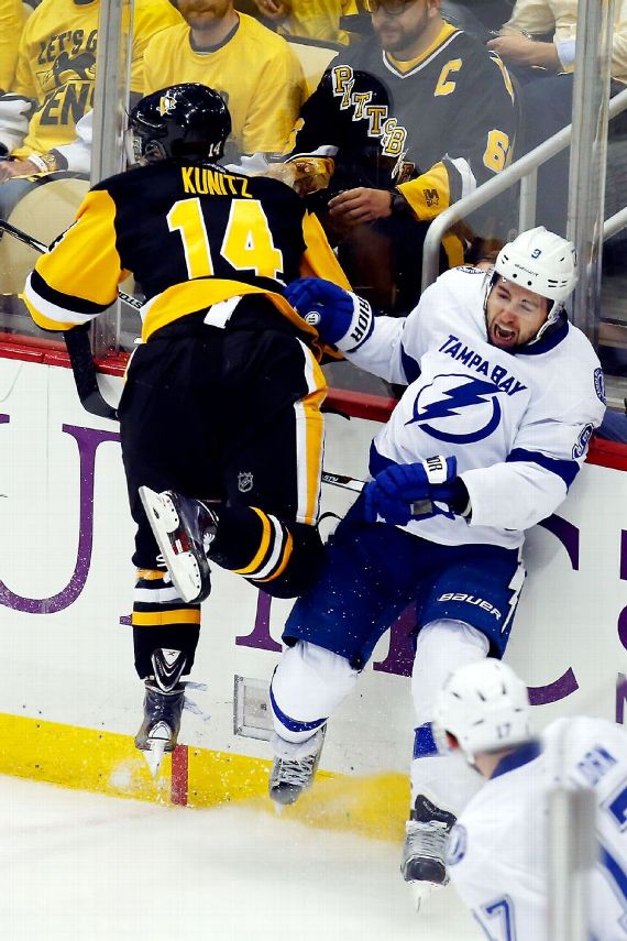 Pittsburgh forward Chris Kunitz collided with Tampa Bay forward Tyler Johnson's right knee with 36.4 seconds remaining in the first. Johnson attempted to skate off the ice before falling and being carried to the locker room, putting no pressure on his right leg. He returned midway through the second period.